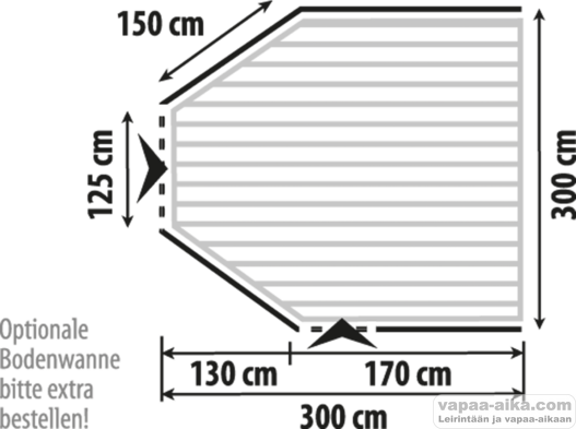 Pystytetyn teltan mitat ovat 300 x 300 x 243 cm (P x L x K) ja pakattuna 96 x 35 x 35 cm.
